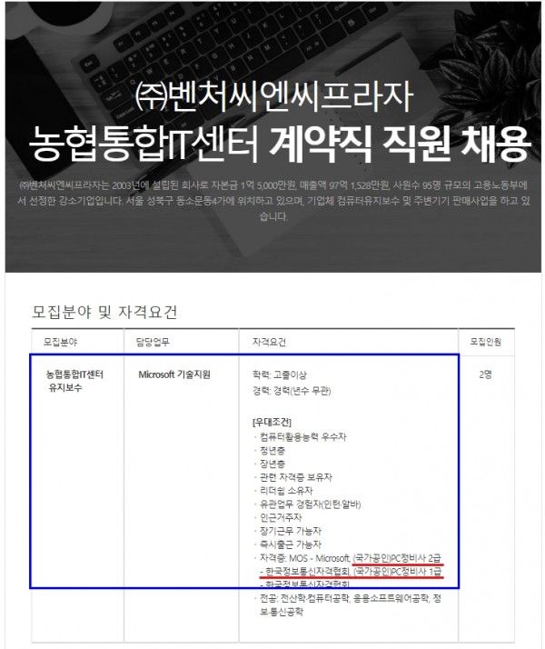 | [채용공고] ㈜벤처씨엔씨프라자 농협통합IT센터 직원 채용(PC정비사) | |