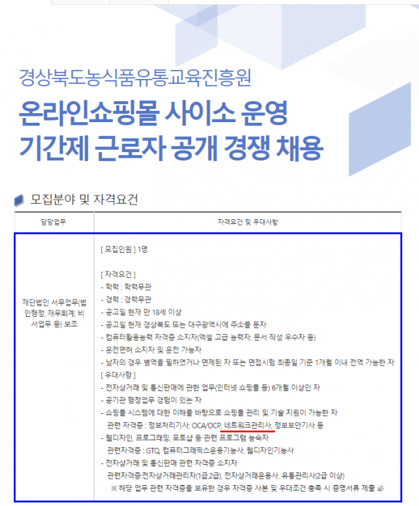 | [채용공고] 경상북도농식품유통교육진흥원 공개경쟁채용(네트워크관리사) | |