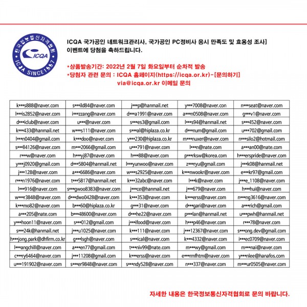 안녕하세요. [ICQA 국가공인 네트워크관리사/국가공인 PC정비사 응시 만족도 및 효용성 조사] 이벤트에 당첨을 축하드립니다. 설문조사에 대한 이벤트 참여 감사와 당첨되신 분들께 다시 한번 축하드리며, 앞으로도 본 협회에서 주관하는 자격에 대해 많은 관심 부탁드립니다. *상품발송기간: 2022년 2월 7일 화요일부터 순차적 발송 [이벤트 당첨자 명단] (※ 이메일 주소 기준) *당첨자 관련 문의 : ICQA 홈페이지(https://icqa.or.kr)-[문의하기] / via@icqa.or.kr 이메일 문의 |