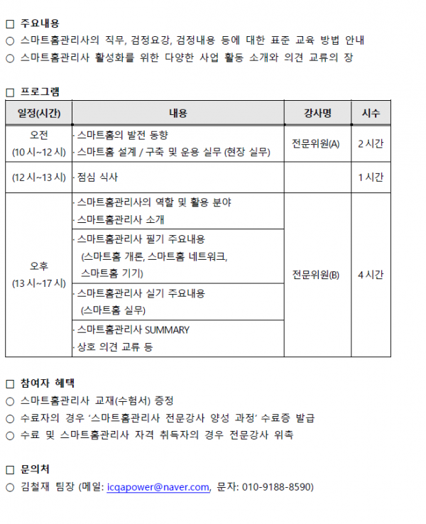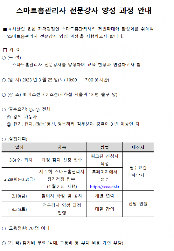스마트홈관리사 전문강사 양성 과정 안내(3월25일(토)시행) > 공지사항